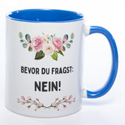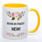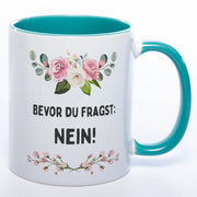 Blümchen-Tasse mit Spruch "Bevor du fragst: Nein!" spülmaschinenfest