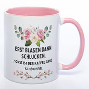 Blümchen-Tasse mit Spruch "Erst blasen dann schlucken. Sonst ist der Kaffee ganz schön heiß." - Lustige Kaffeetasse spülmaschinenfest