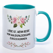 Blümchen-Tasse mit Spruch "Liebe ist, wenn beide vom Waldspaziergang zurückkommen." - Lustige Kaffeetasse spülmaschinenfest