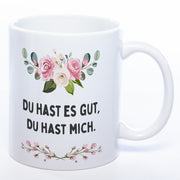 Blümchen-Tasse mit Spruch "Du hast es gut, Du hast mich" - Lustige Kaffeetasse spülmaschinenfest