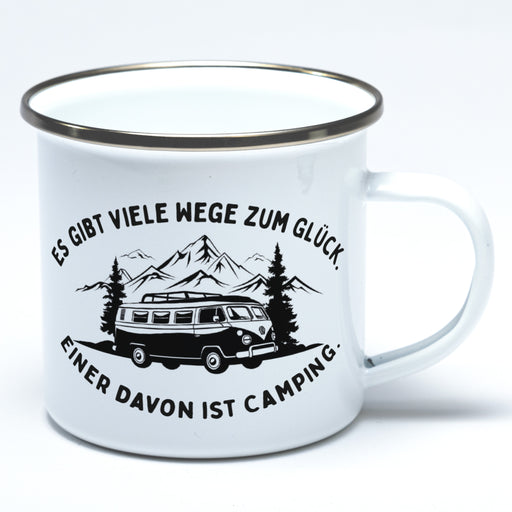 Vollständige Details anzeigenEmaille-Tasse - Es gibt viele Wege zum Glück. Einer davon ist camping. mit Campermotiv